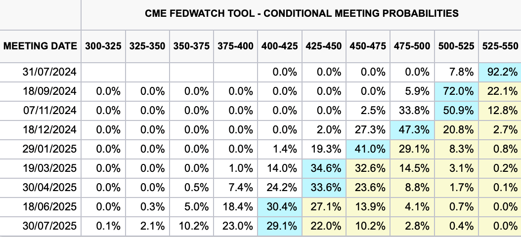 The consequence of all this is that the market now gives a 78% (cumulative probability) chance of the first rate cut happening in September and the second in December, compared to just 64% last week.