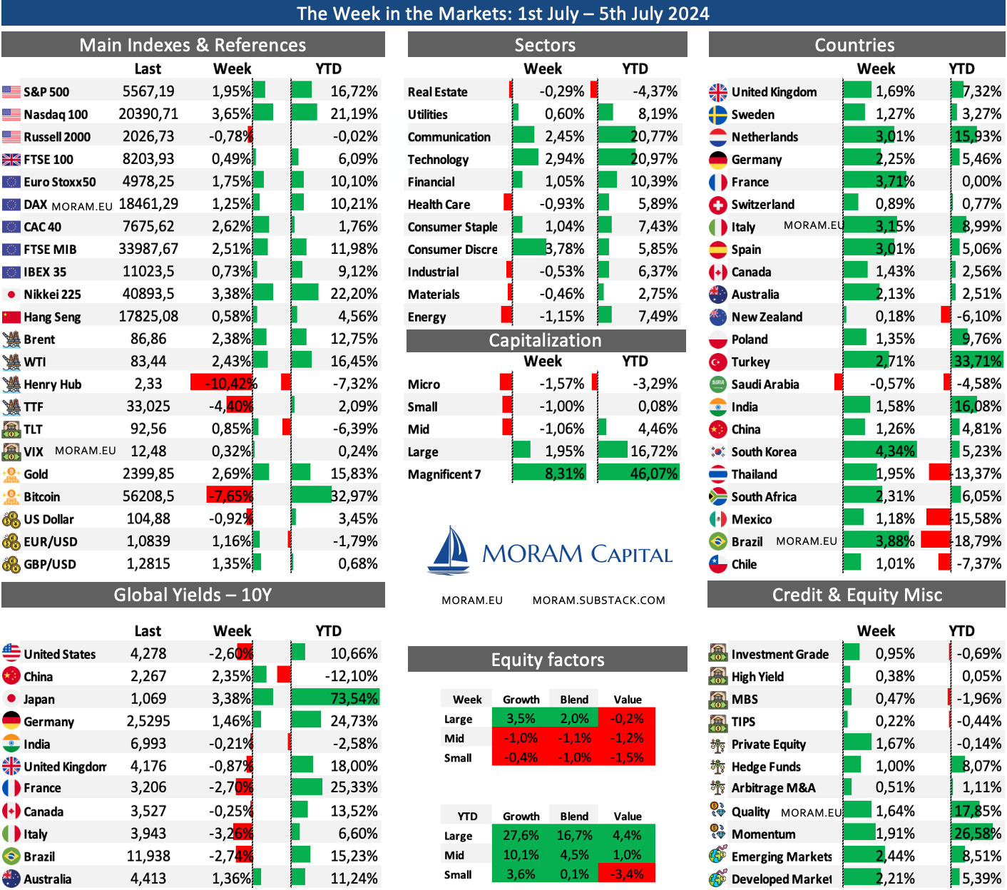 A week with little activity due to the 4th of July holiday but which nevertheless brought new records in the form of All-Time Highs for the S&P 500 and the Nasdaq. The ones responsible are the Mag7, with Tesla up 27%, Apple up 7.5%, Meta up 7%, Alphabet and Microsoft up more than 4.5%, Amazon up 3%, and NVIDIA nearly 2%.