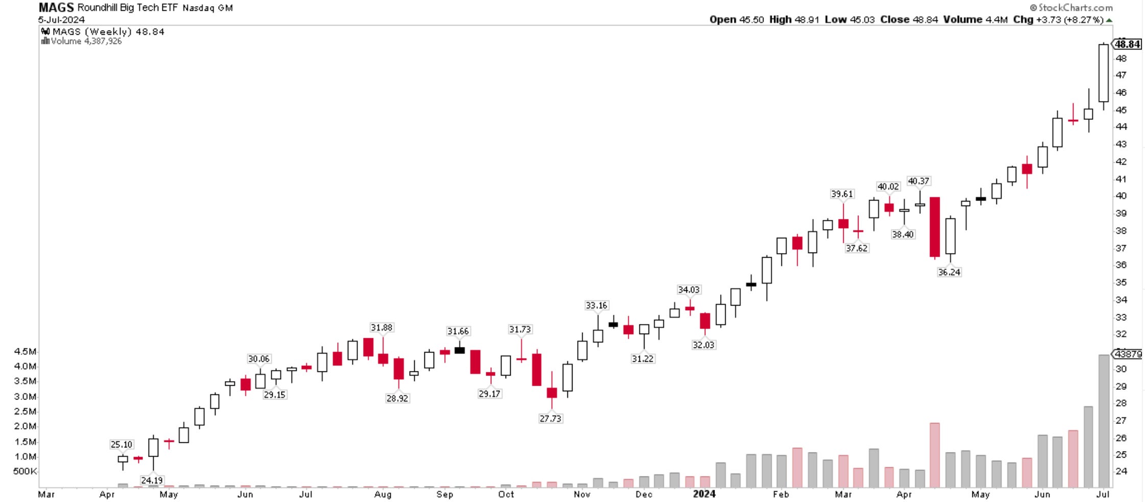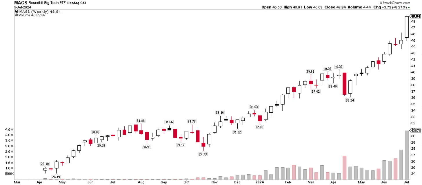 The equity factors chart makes it quite clear that despite the All-Time Highs of the S&P and NASDAQ, the week was bad for the rest of the companies as reflected by the Russell 2000. By sectors, no mystery, the top three are those that have components from the Mag7 (Tesla and Amazon - Consumer Discretionary, Microsoft, NVIDIA, and Apple - Technology, and Google and Meta - Communication). The explanation is that money is flowing into the $MAGS (ETF of the Mag7) and this is dragging the market, which from a technical standpoint, is entering a parabolic rise.