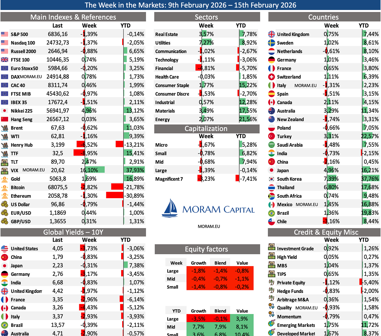 Last week turned risk-off across major indices, with both the U.S. and Europe closing in negative territory. The pressure was particularly visible in Financials - which is increasingly perceived as exposed to AI-driven disruption - and the Magnificent 7 due to the sheer scale of capital expenditure required to sustain the AI race