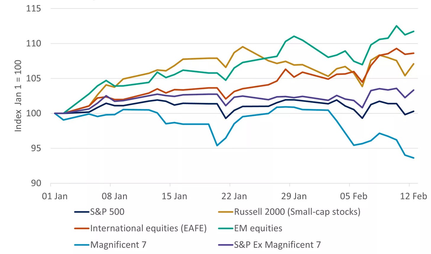 Capital is flowing out of industries seen as easily disrupted by AI or trading at extremely elevated multiples, and moving back into hard assets - Energy, Materials, Industrials - as well as emerging markets, which have historically performed well in this type of environment.