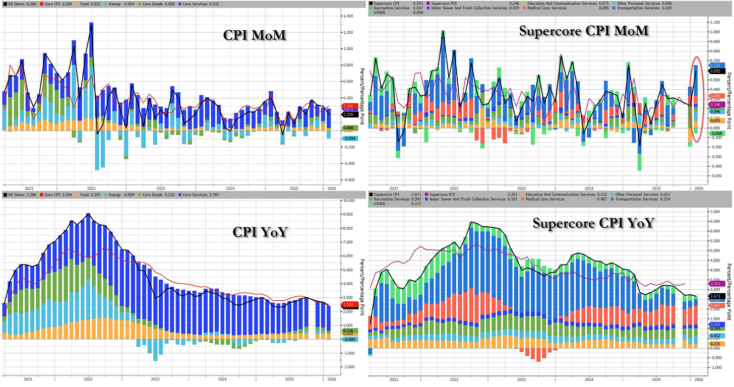 Core CPI rose 0.30% (vs. 0.34% expected), with goods inflation remaining contained. However, supercore services (ex-housing) jumped 0.63%, driven by transportation and education.