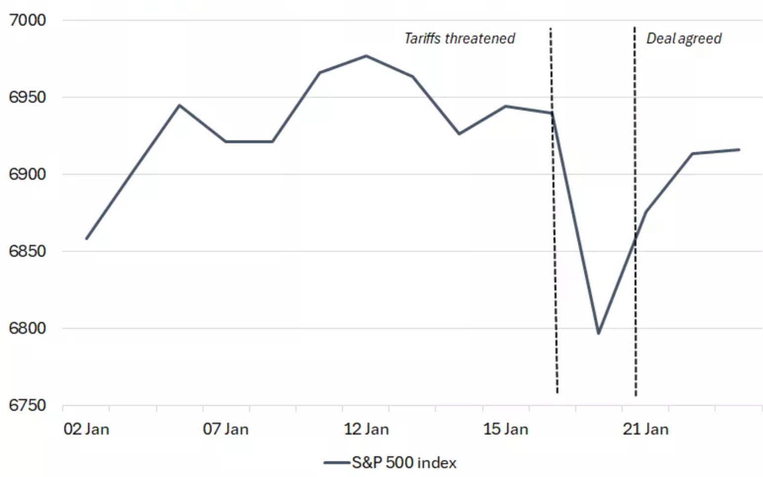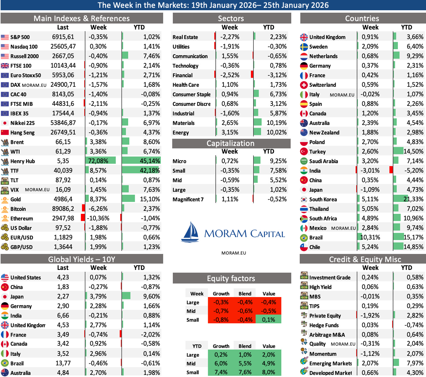A highly volatile week for markets, driven mainly by the incipient escalation of geopolitical tensions around Greenland, where the US administration even went as far as threatening tariffs. Those tensions gradually eased over the course of the week, allowing equity indices to finish largely flat. In other words, yet another TACO trade in recent months.
